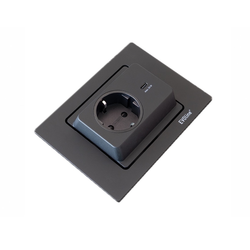EVOline Spin można wyposażyć w nowoczesną ładowarkę USB-C o mocy 20 W, która bez problemu zasila nawet bardziej wymagające urządzenia, takie jak smartfony czy tablety. Alternatywnie, zamiast ładowarki, dostępna jest opcja z dodatkowym gniazdem zasilającym.