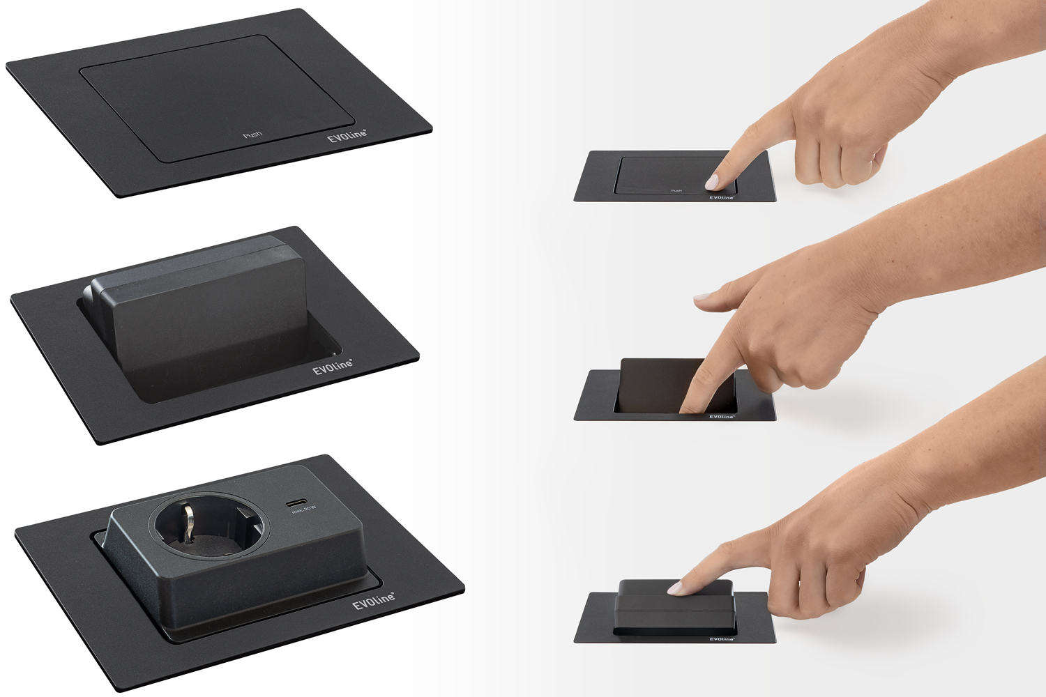 Spin to stylowe i funkcjonalne rozwiązanie stworzone z myślą o niewielkich przestrzeniach. Dzięki mechanizmowi obrotu o 180 stopni urządzenie odsłania moduł z gniazdem dopasowanym do standardów międzynarodowych, gniazdem typu Euro lub wydajną ładowarką USB-C. Po zamknięciu pozostaje niemal niewidoczne – jego płaska powierzchnia harmonijnie wtapia się w blat roboczy.
