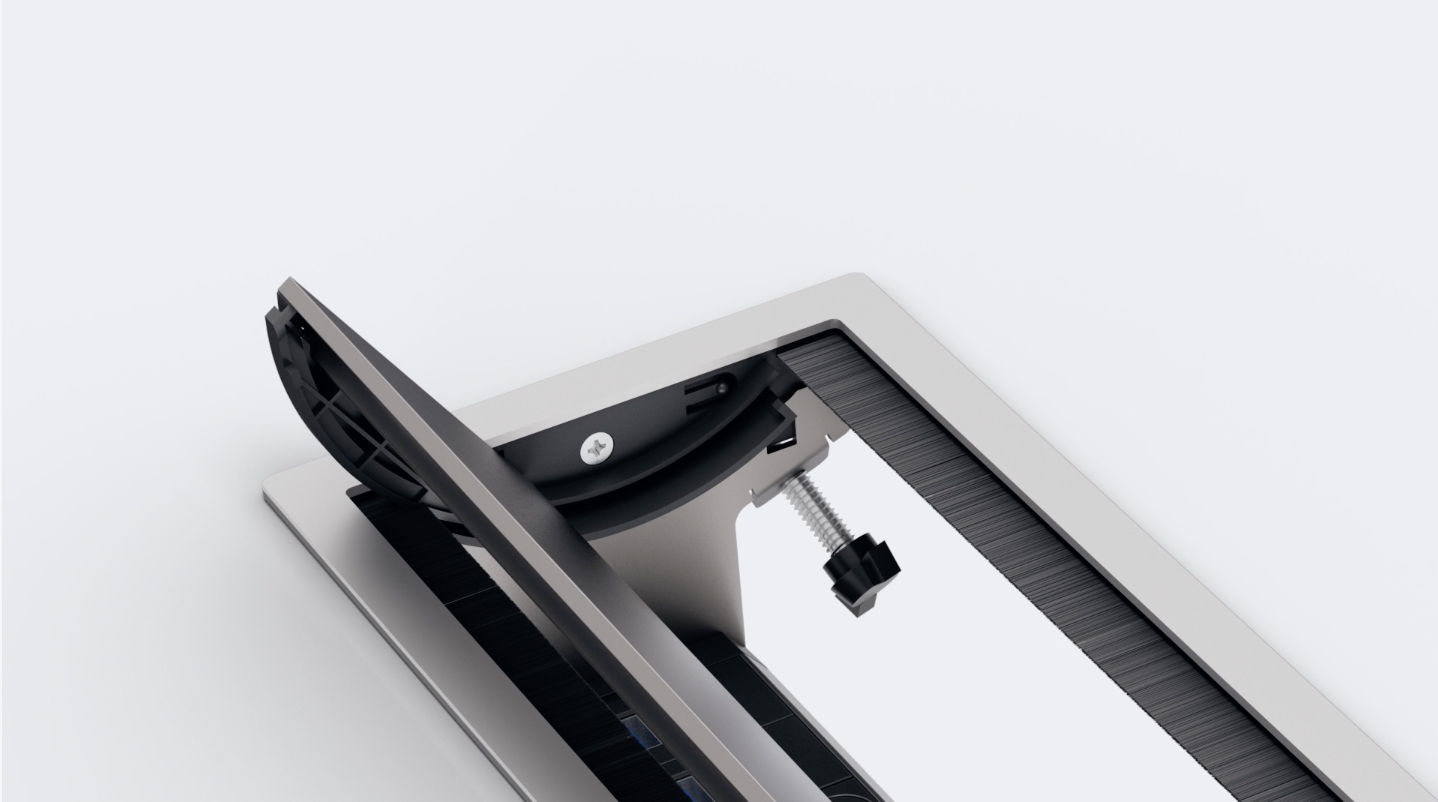 Pokrywa VersaFlap Dual została zaprojektowana tak, aby umożliwić dostęp do modułu zasilania z obu stron. Może się uchylać w obu kierunkach, obracając się na dwóch bolcach zamontowanych wewnątrz ramy. Dzięki temu rozwiązaniu idealnie sprawdza się w miejscach pracy współdzielonych, takich jak przestrzenie coworkingowe, sale szkoleniowe czy biblioteki.